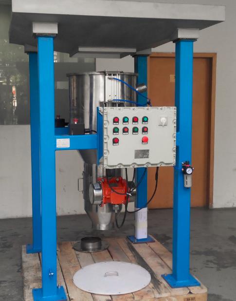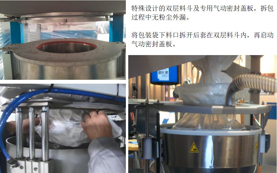 * 本設(shè)備新設(shè)計(jì)了雙層料斗和塵氣出口,塵氣出口經(jīng)管道與過(guò)濾除塵器(可選配)或用戶中央除塵系統(tǒng)相連,大大減少了特別是易揚(yáng)塵物料對(duì)人體的傷害和環(huán)境污染。