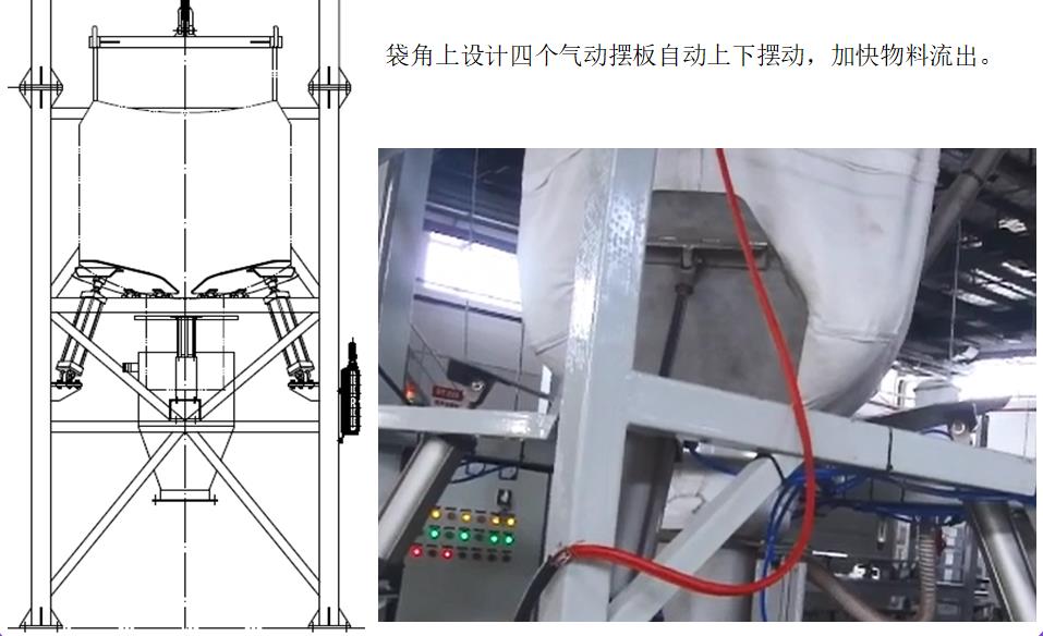 人工操作設(shè)備上的電動(dòng)葫蘆將噸袋包裝物料提升到進(jìn)料口,將包裝袋下料口拆開后套在雙層料斗內(nèi),再啟動(dòng)氣動(dòng)密封蓋板,打開氣力助流擺動(dòng)板以使袋內(nèi)物料盡快流出。